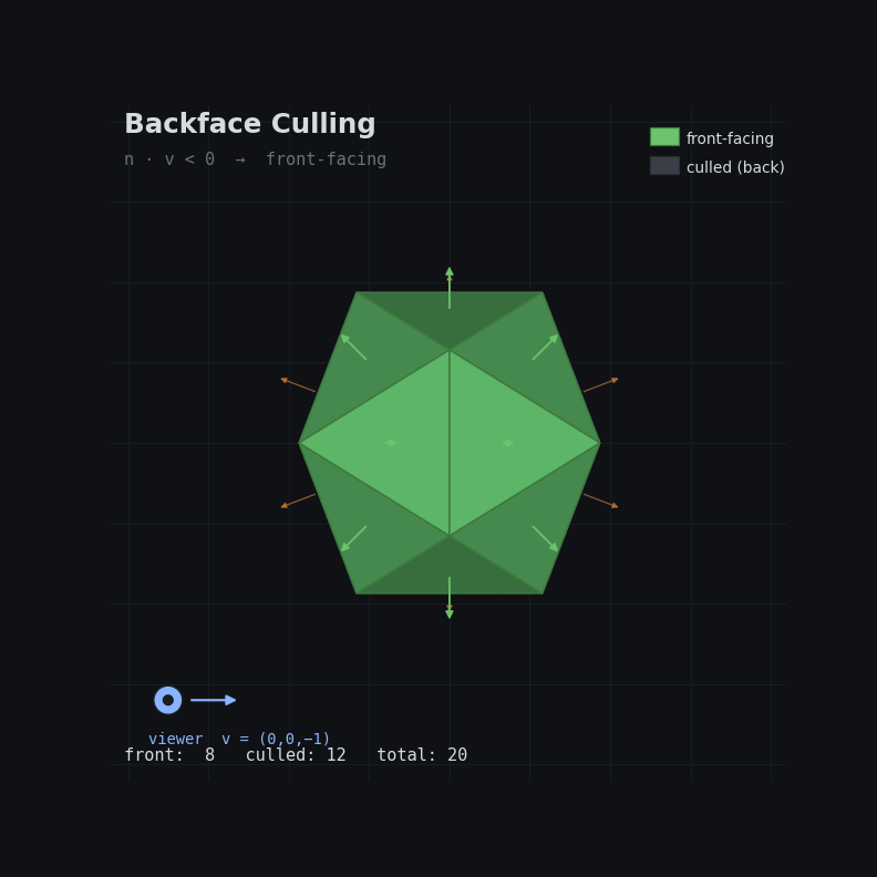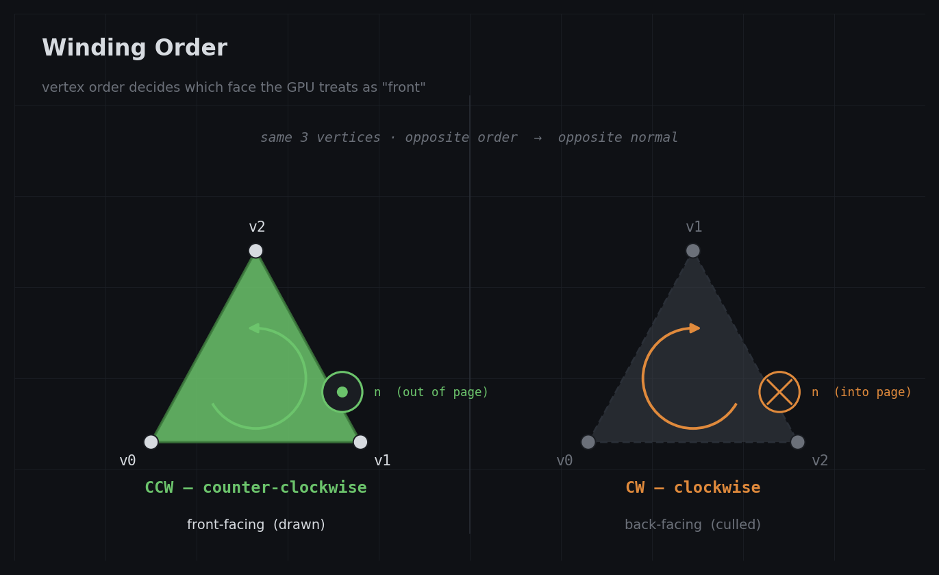 Every triangle has a front face and a back face. For closed meshes, back faces are never visible because they’re inside the object. The GPU can automatically skip them based on winding order, which saves roughly half the rasterization and fragment work for typical geometry.