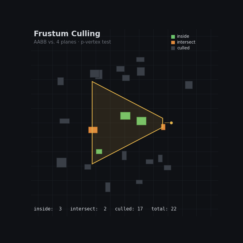 For a perspective camera, the view frustum is the truncated pyramid-shaped volume that represents what the camera can see. Anything outside of it doesn’t need to be rendered. Frustum culling tests objects, usually via bounding volumes like spheres or AABBs, against the six planes of the frustum and skips anything that doesn’t intersect.