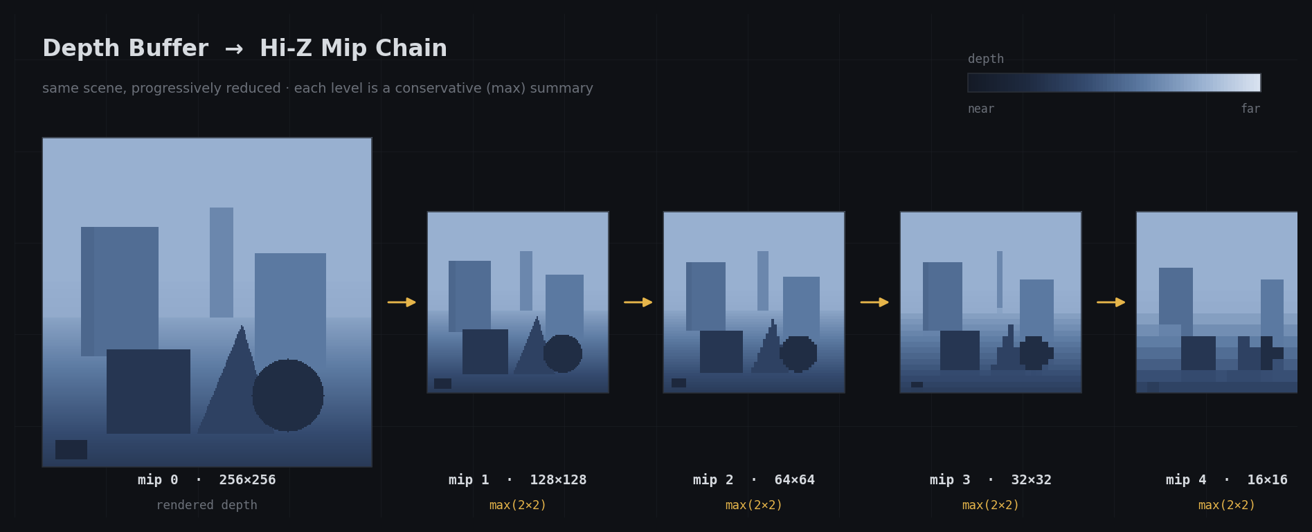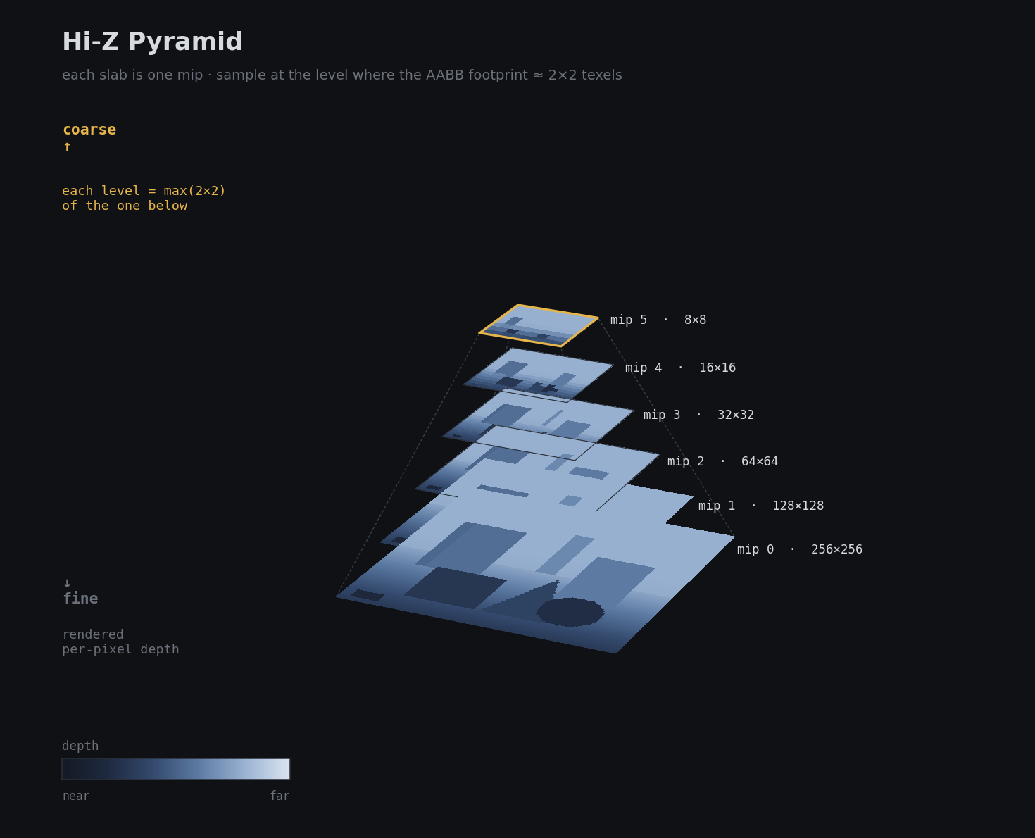 Hi-Z is a mip chain of the depth buffer, often called a depth pyramid, where each level stores a conservative depth value for a larger region of the screen.